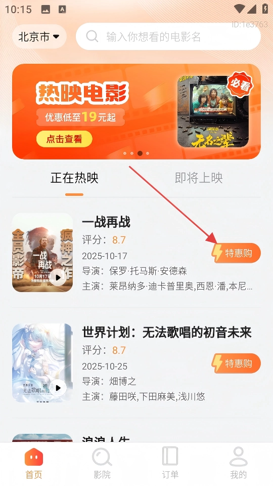 1、在首页找到想要观看的电影,点击【特惠购】,可进入影院列表页面。