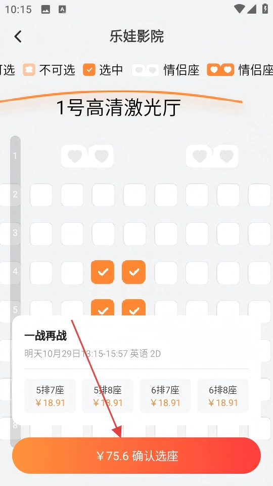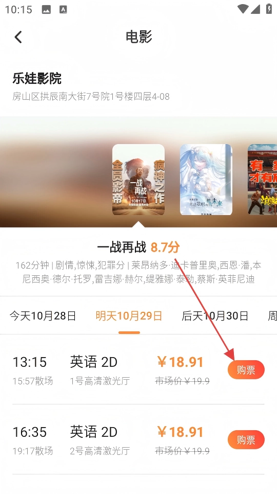 3、在电影场次页面,选择合适场次后点击【购票】,可进入选座界面。