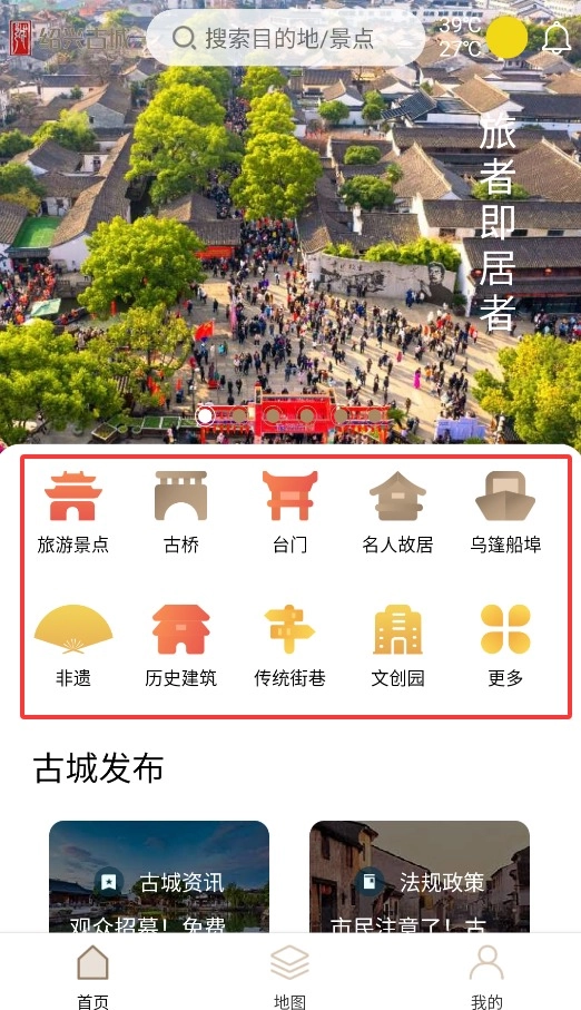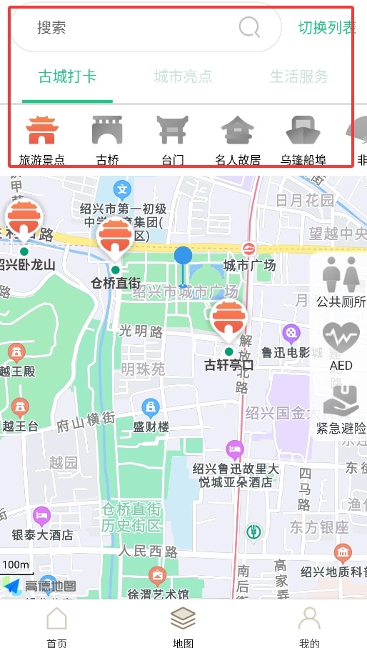 4、进入地图导航界面,可搜索或查看古城打卡点、城市亮点及便民服务信息。