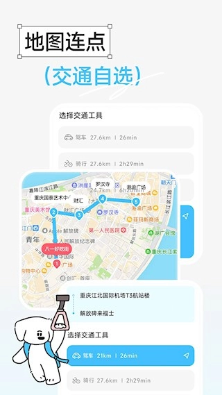 3、路线直观规划:切换地图模式查看全部行程地点,选择合适交通方式连线,避免路线绕远。