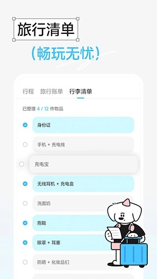 4、行李清单管理:配备多样物品模板,允许自行添加项目,出行前逐项核对检查,防止遗漏必需物品。