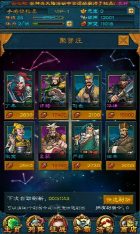 首先查看自己主将的天命情况:刘备与张飞、诸葛亮之间存在天命加成效果,因此这两位武将是队伍里必须配备的;张飞和刘备一样几乎是必选的,唯一的问题在于诸葛亮的获取难度相对较高、比较少见。如此一来,队伍中就确定了刘备、张飞、诸葛亮这三位核心人物的位置。