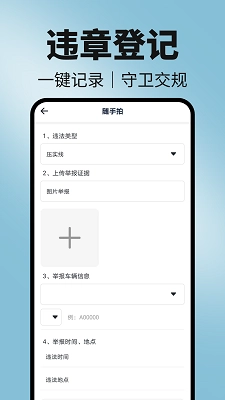1. 违章举报:提供详细的违章类型选择,如闯红灯、逆行、违停等,方便用户准确分类举报。