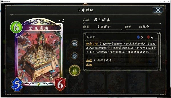 城塞(小区)皇这套卡组的核心运营围绕君主城塞展开,君主城塞属于任务类卡牌,当有10张指挥官进入战场后,就能从卡组中瞬念召唤它。这张卡的本体效果是带有【操纵】能力,进化后拥有疾驰和双击效果,身材为5-6,搭配卡组里的增益卡牌可以实现OTK。
