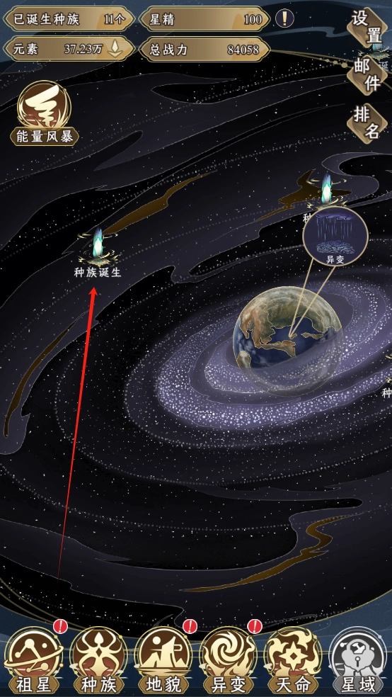 1、进入祖星发展模拟游戏后,点击“种族诞生”来推动祖星发展并提升战力,种族数量越多,祖星的战力就越高;
