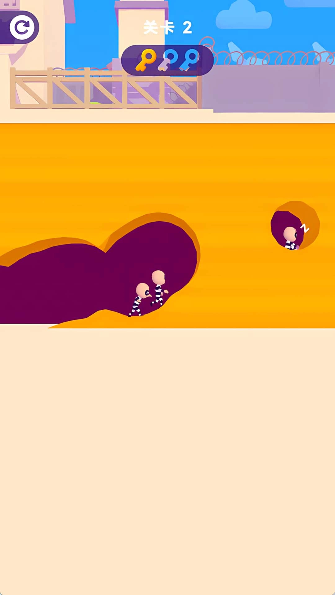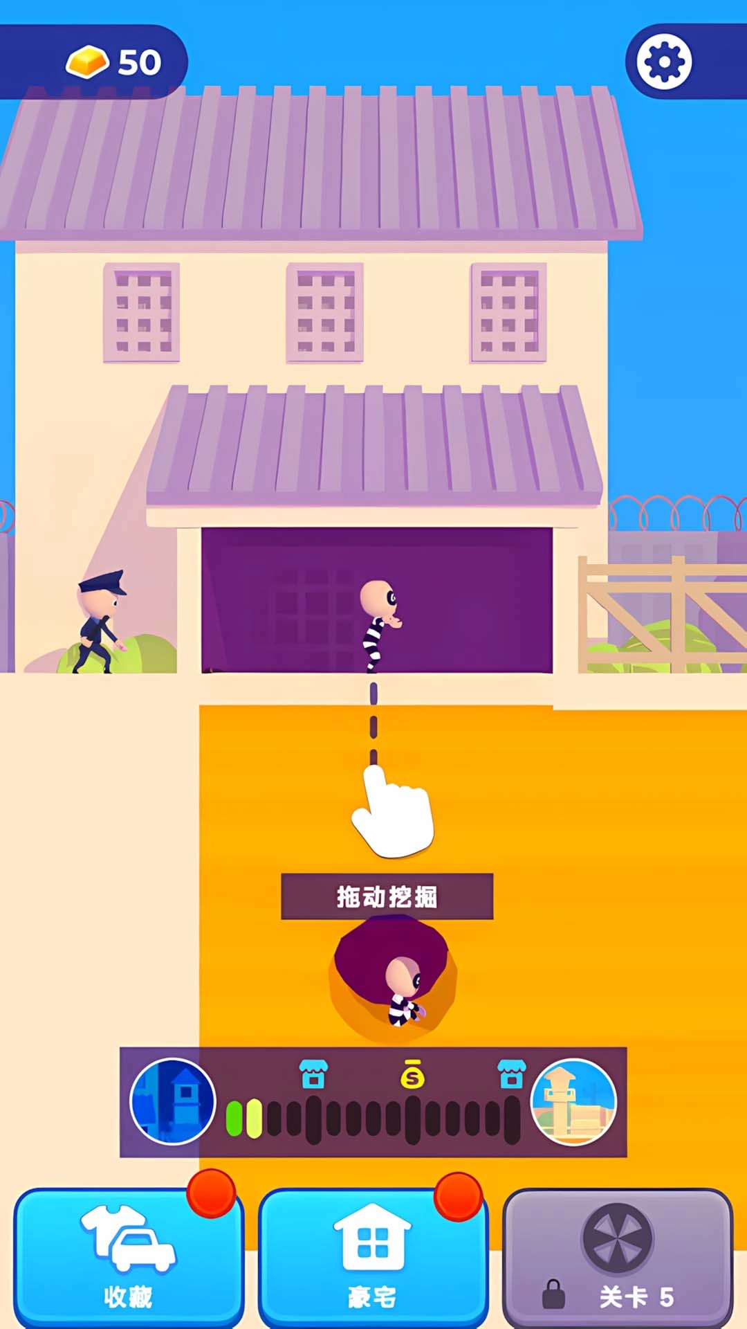 1、进入场景当中,拖动角色进行挖掘,逃离狱警的追击。