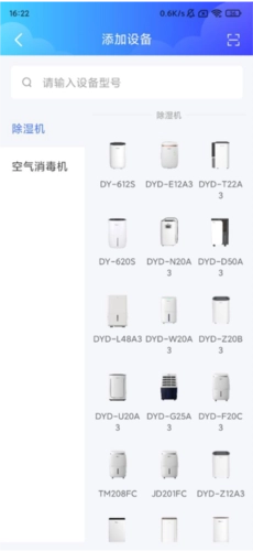 2、可添加除湿机和空气消毒机,添加前需选择正确的款式。若以下列表中没有您的除湿机型号,可在搜索框输入设备型号进行查找。