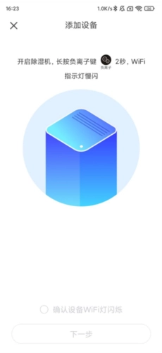 4、开启除湿机,长按负离子键2秒,WIFI指示灯慢闪;