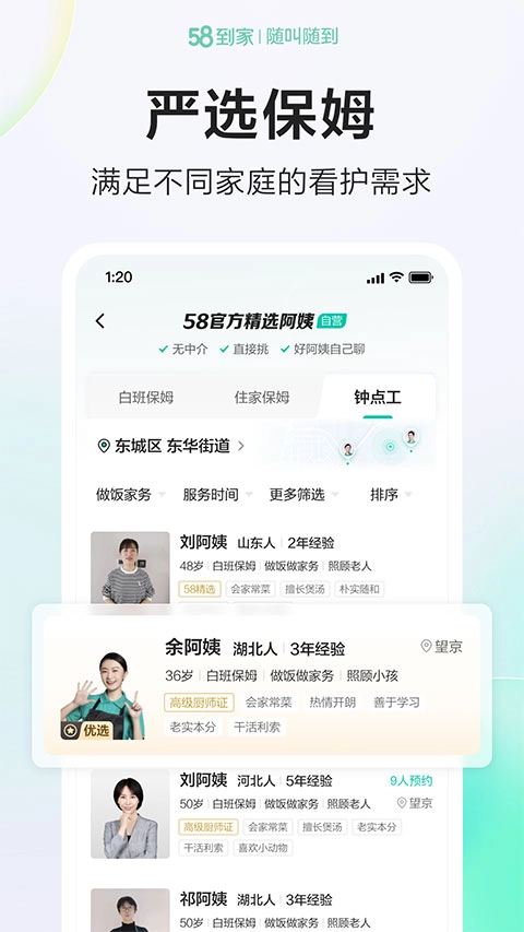1、为满足用户需求,您可以足不出户面试阿姨,无接触,更放心;
