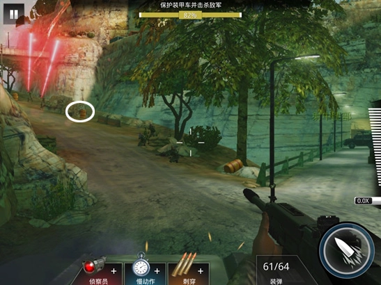狙击手很容易辨认,他们搜寻目标时,武器会发出红色的射线光。此外,要是地图上有油桶——就是图中画圈的部分,油桶爆炸能炸死周围的士兵,后续的其他任务里也是这种情况。(如下图)