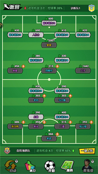 1、进入训练关卡时可以调整阵容,点击开球即可比赛。