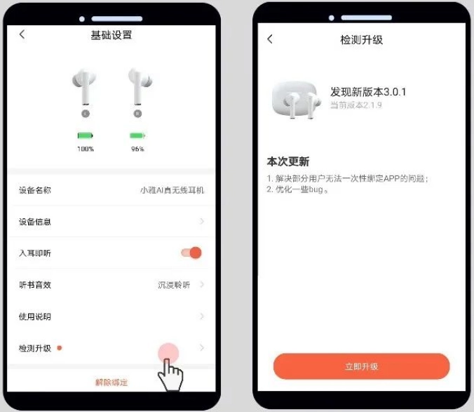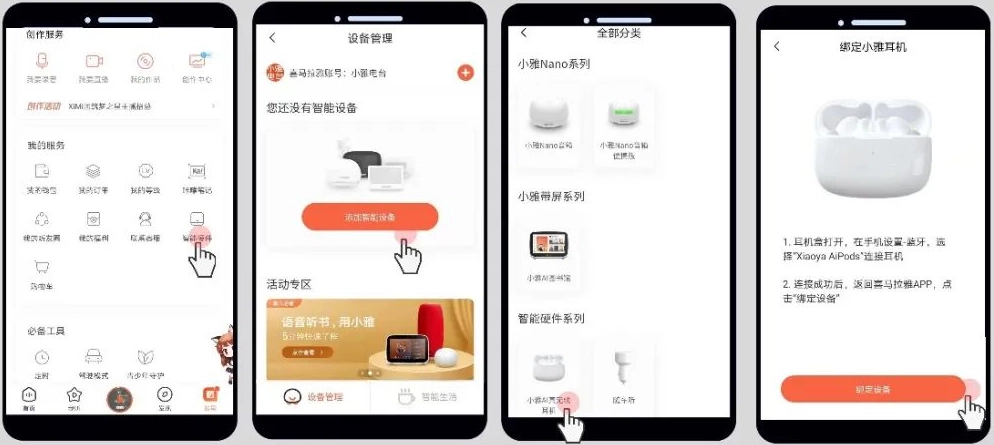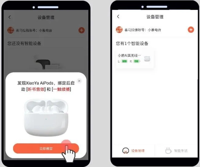 特别提醒:使用苹果手机或iOS系统的用户,需打开喜马拉雅应用,依次进入【账号-智能硬件-添加设备-小雅AI真无线耳机】页面,手动完成设备绑定操作。