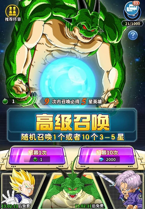 1、游戏内召唤是获取英雄最直接的方式,有普通、高级、友情三大招募方式,点击即可抽取。