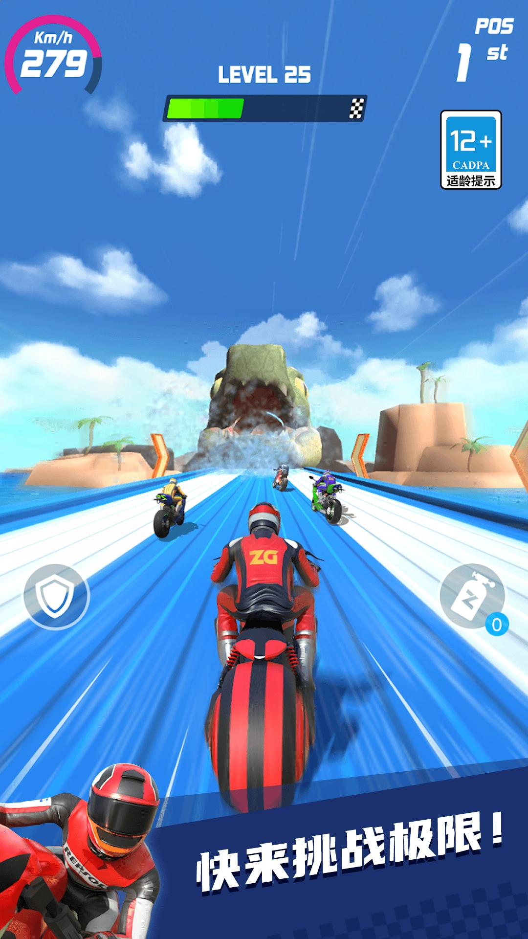 3、科学规划行驶路线以快速抵达终点,唯有成功冲过终点线才算完成比赛,不然就只能继续操控摩托车持续前行。