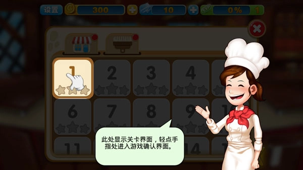 您的目标是尝试制作各类菜肴,成为星级厨师的粉丝,现在就从游戏的新手教程开始吧,这里显示关卡界面,轻点手指指示的位置进入游戏确认界面。