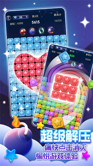 清新的面板设计,酷炫的游戏特效,星空场景,定会带你畅游在消除的星星世界中。