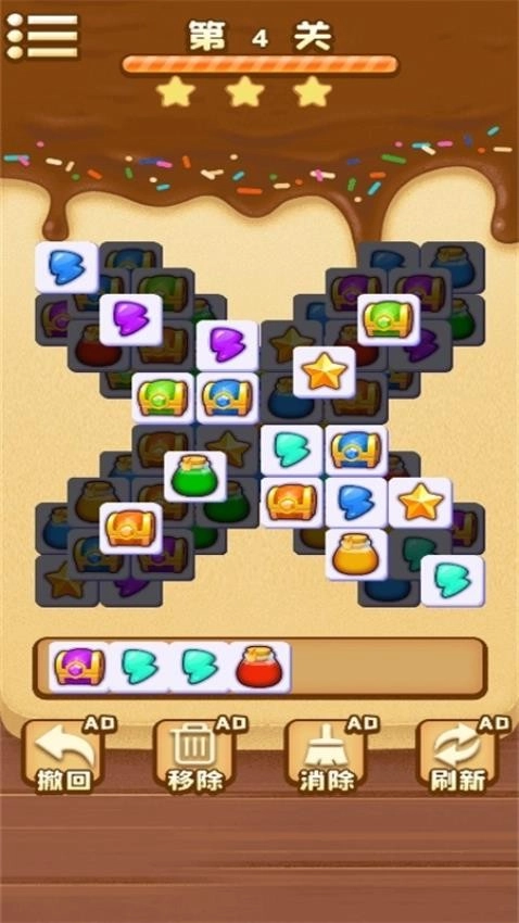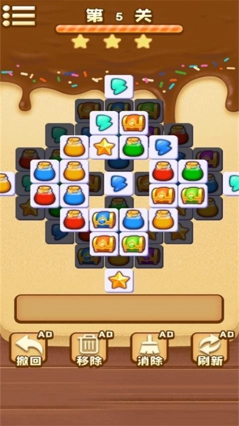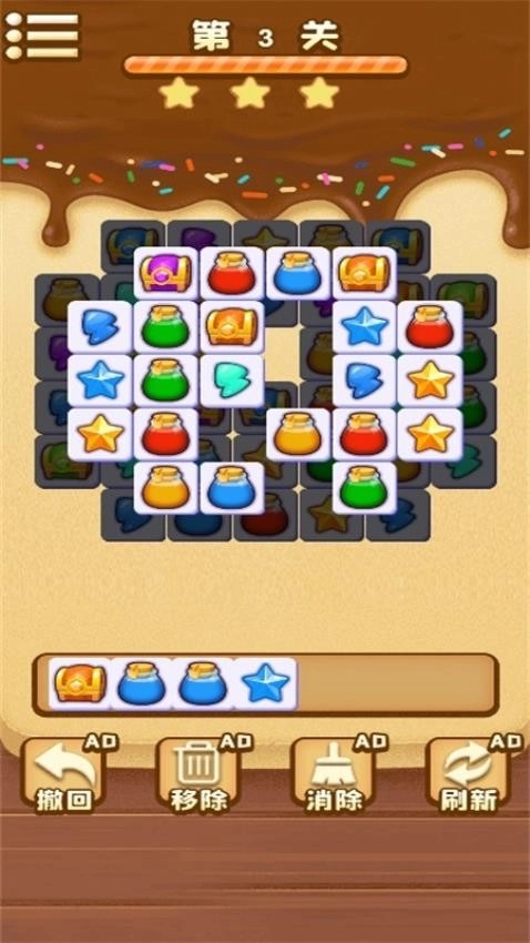 游戏采用了简单三消的方式,只需找到三个相同的元素,便可将其放在空格中。