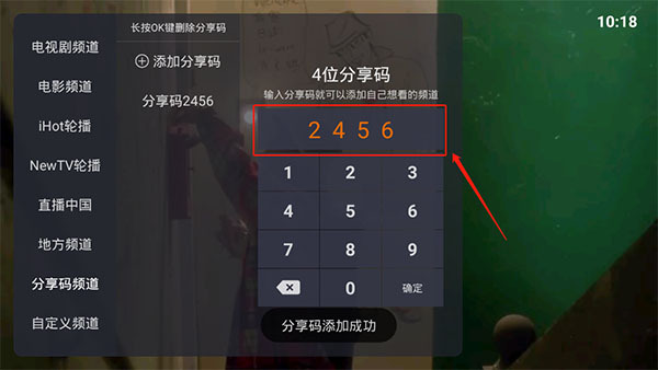 2、在分享码中输入2456即可添加更多的影视频道。