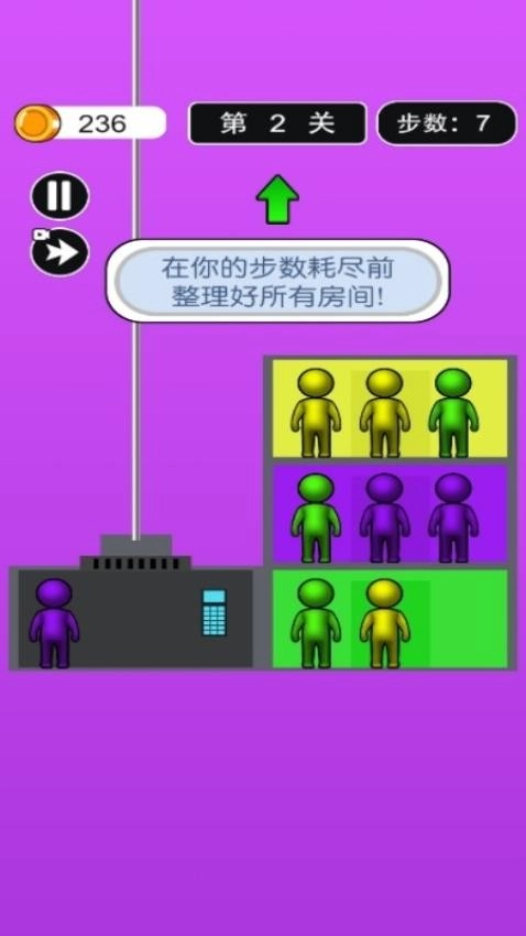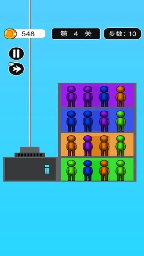 这是一款玩法十分有趣的小人闯关游戏——电梯大分派。在这个充满趣味与挑战的游戏里,你得做好充分准备,把人们送到指定楼层。游戏的核心玩法是,在电梯运行时,巧妙地决定搭载或放下那些和楼层颜色对应的小人,保证他们能精准地到达并停留在正确的楼层。