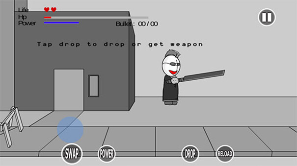 4、进入游戏后,通过在左侧屏幕移动蓝色圆圈即可操控角色行走;左上角的爱心代表当前生命值,hp经验和power力气需要一定时间恢复;底部设有快捷按键,例如点击Drop就能释放机械手中拾取的武器。