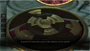 18、将扳手插入右下方孔中并摇动,圆形片散开露出木板;用目镜观察木板,拼接类似第二章的图案(摸索后易完成);