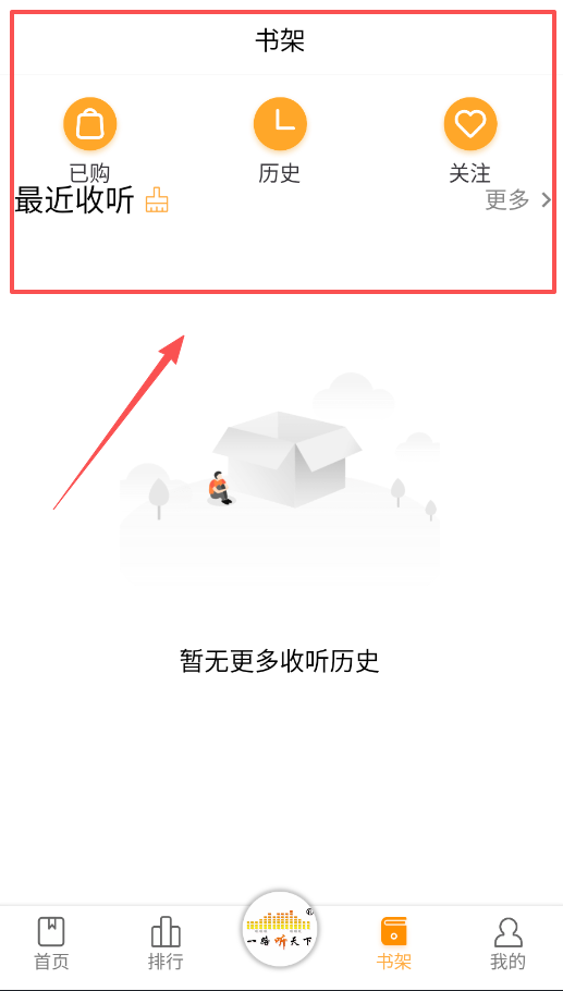 3、收听和管理内容的功能都集中在书架板块,这里会记录你的最近收听内容、已购书籍以及历史记录,能让你快速找到并继续播放未听完的内容,或是定位到已购买的书籍。