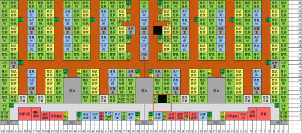 1、布局图下方首先是室外区域。考虑到住客基本不会前往室外,为方便路人使用,便将其设置在最下方。接着是客房区,共有42间客房,和式与西式各占一半。由于客人抵达后通常由招待人员引导至客房,之后才会自行活动,所以为缩短路程,将客房区安排在前台附近。同时,通过大量植物来提升景观效果,并借助储藏室、洗手间与休息处的组合布局,增强整体的契合度。