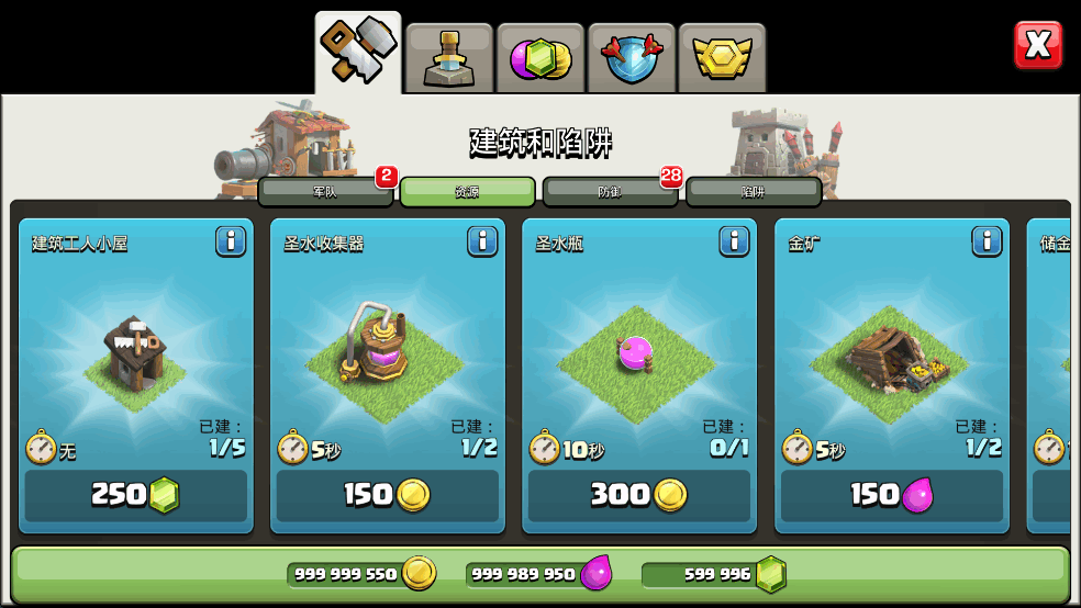 (1)村庄地图共有两块,分别是第一大本营和第二大本营,4级及以上的玩家,均可在原有第一大本营岸边,点击修复小船,可以传送到第二大本营。这两个大本营的钻石是共用的,而其余金币、圣水、各种建筑、各种资源,都是独立的,玩家分开来使用。