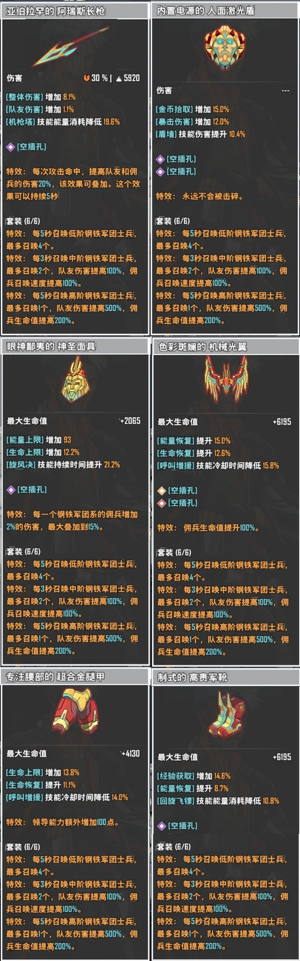 这套装备的特性是每隔几秒会召唤出不同品质的钢铁军团士兵协助作战。只要你处于存活状态,这些帮手就会持续不断地加入战局。穿戴的装备数量越多,整套装备带来的属性加成也就越显著!