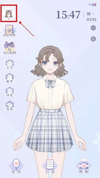 之后将正式进入次元世界,软件界面类似于手机主界面的操控,其中左上角显示的是当前时间,下方的功能则是:装扮、日常和照相。