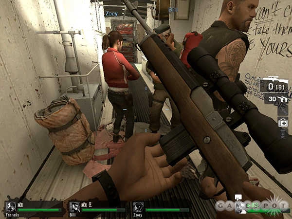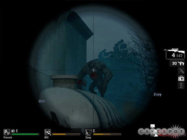 出门后往左走,要格外留意那几个BOSS级别的僵尸,简单说明一下:SMOKE能远距离用舌头把人卷走,消灭它之后会冒出浓重的烟雾,非常呛人;HUNTER是动作迅猛的杀手,和HL2里的快速僵尸类似,会把你扑倒(就像把你当成萝莉一样,先侵犯再杀害,真是让人无语!);Boomers会投掷炸弹(或者是喷射东西?),被它攻击到的人会暂时失去战斗能力,眼前一片绿光,挺有意思的。这家伙通常藏在不容易被发现的地方,一定要多加小心。散弹枪的威力似乎比HL2里的大很多,能够一下子解决掉近处的三四个僵尸,就算有一群僵尸冲过来,几枪也能搞定。另外,普通僵尸特别愚蠢,你把炸弹扔出去之后,它们居然会跑过去围在炸弹旁边观看,太让人无语了!那个WITCH会发出凄惨的哭声,听到之后最好把电筒关掉,不要去招惹她,不然你会下场很惨。她一般都专注于自己的事情,趴在那里不知道在忙些什么。