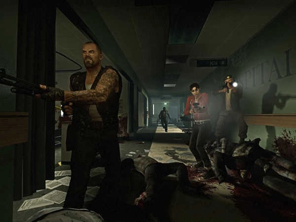 推开门,往左边行进。医院内分布着不少房间,对付房间里的僵尸,最稳妥的办法是把房门给他们关上。走到标有EXIT字样的门口并进入,然后登上楼梯。大厅的天花板在滴水,接着顺着楼梯继续往上抵达第二层,又有大批敌人涌了过来。继续向更高楼层前进,到达电梯所在位置后,先拾取电梯旁的弹药,按下电梯按钮,大量敌人再次冲了过来。这场激烈的战斗差点让我们全军覆没,真是惊险!