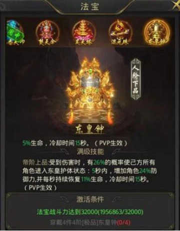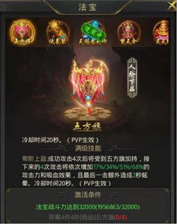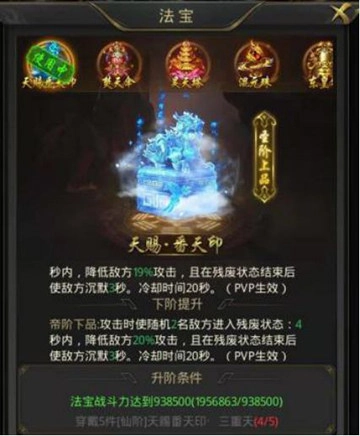 5阶法宝(龙城二层开启后可兑换,开区120天混沌龙城有概率掉落),属于单体攻击类法宝,当四次命中敌方目标后即可触发效果,触发后接下来的四次攻击将获得高额攻击加成、强力吸血效果以及单体控制效果,建议主玩符咒职业的玩家优先选择。