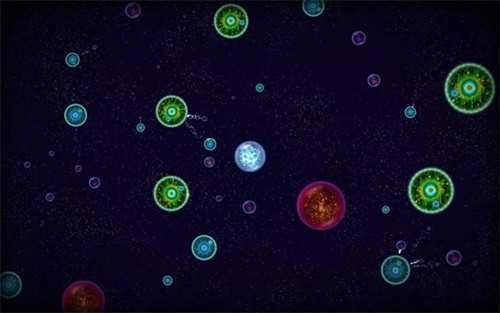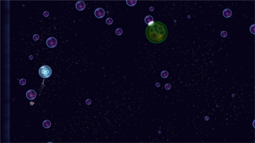 2、在《星噬》这款游戏里,玩家操控的是一个球体形态的物体。当玩家点击星球的某一侧时,星球就会发射出气泡,同时自身会朝着点击位置的相反方向移动。点击的频率越高,星球移动的速度就越快,其体积缩小的速度也会相应加快。玩家正是借助星球喷出气泡产生的惯性来进行游戏操作的。