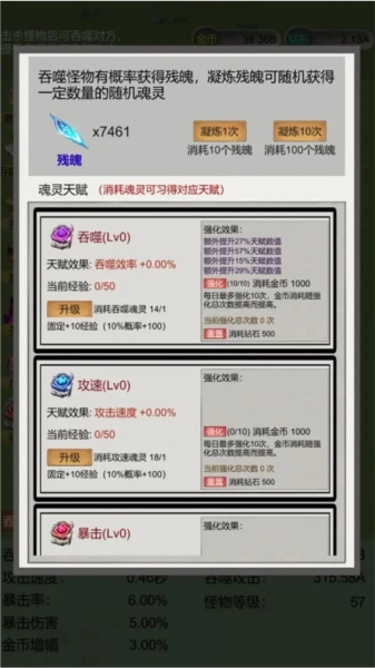 2、除了暴击外,剩下推荐金币效率、暴击伤害、吞噬效率按着顺序点,速度可有可无(能秒杀就不需要太高)