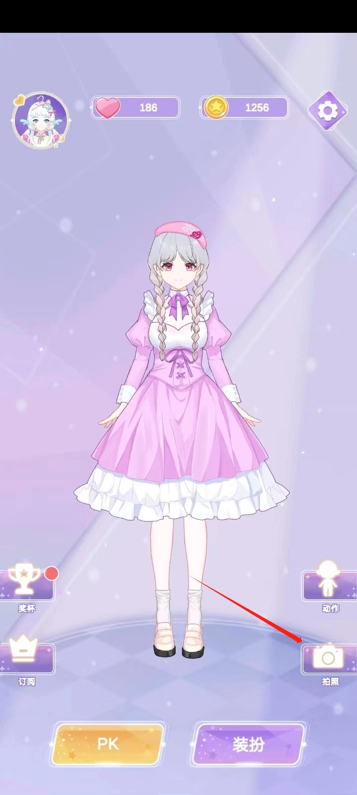 4、之后就会回到最开始的那个页面,我刚刚完成的装扮任务也已经保存好了,点击旁边的【拍照】按钮就可以了。