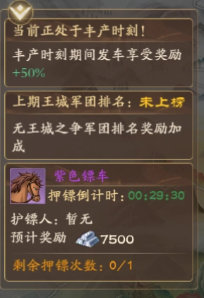 ✦玩法开启期间,召唤师能在押镖界面接取镖车,系统会生成一辆随机品质的镖车,要是对当前品质不满意,可消耗元宝刷新(刷新次数有上限),镖车品质越高,对应的奖励也越丰厚。