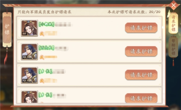 ✦【帮助护镖】列表展示来自其他军团成员的护镖请求,召唤师成功成为护镖人后即消耗今日护镖次数,护镖奖励待押镖人发车后通过系统邮件发放。