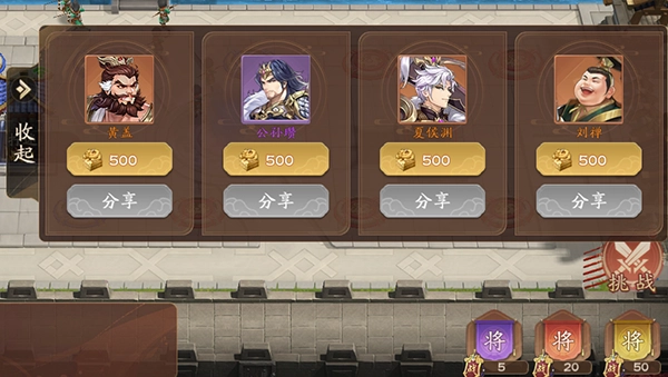 1、战斗中随时可通过右下角的召将按钮刷新武将,可在武将展示面板中购买武将或将其分享给队友购买