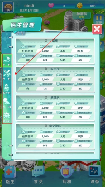 1、游戏内设置了内科、外科、妇产科、儿科、肿瘤科五种不同科室的医生岗位,玩家能够针对每个科室招聘对应医生,以此扩充医院的人员配置。