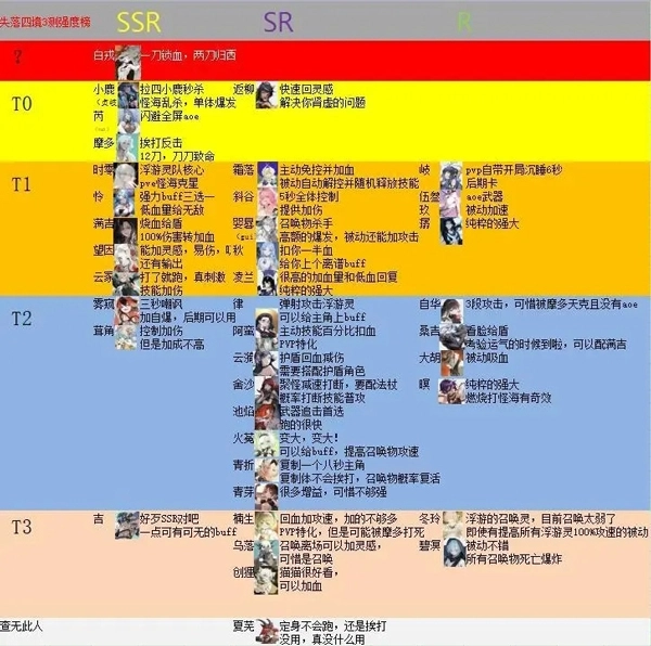 失落四境强度榜(“节奏榜”)如下图所示,小伙伴可以根据自己的理解来选择优先提升的人物。
