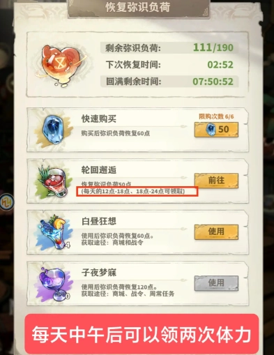 1、每天的12点到18点、18点到24点这两个时段,每当时间一到,首页右上角的体力图标就会出现小红点提示,一天总共可以领取100体力。