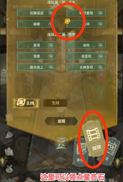 2、任务栏那里手账进去点回顾可以领一些遗漏的星芒石