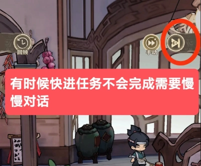 4、有时候做任务点击右上角跳过可能会发现任务并没有完成,这时候就需要你慢慢点屏幕看它自己完成
