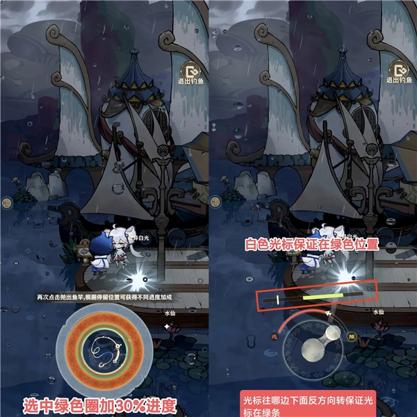 5、钓鱼务必把圈缩在绿色圈上有30%加成,然后进去后让光标稳定在绿条上,这样可以加快钓鱼速度