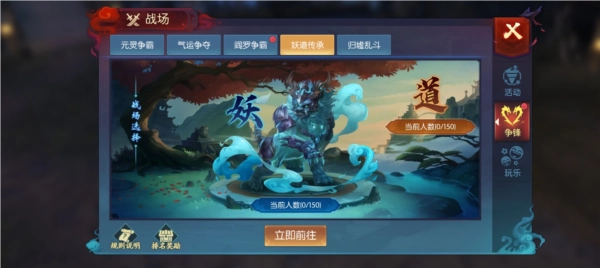 3.战场分为妖法传承和道法传承两个场景,活动时间内,玩家可根据自己的喜好选择任一场景进入,中途可退出和切换场景,积分保留。
