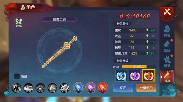 与精灵榜类似,提升点为等级、属性、幻形,对应道具为精华、魂魄、幻形卡。获取魂魄优先级高,属性提升后根据竞争度买精华,提前冲榜,同阶先升阶排名靠前。(幻形卡需在神装寻宝里抽)