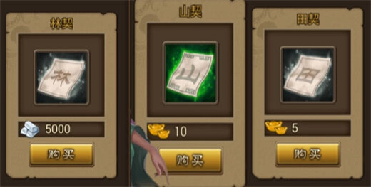 另外商店还有概率产出田契,山契,林契各种契约,双击可获得若干粮草和铜钱。