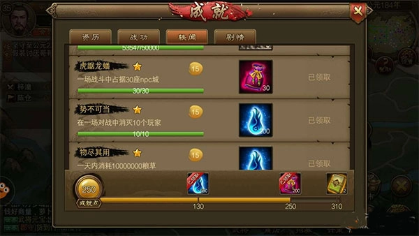 自从刺史阶段开始,整张地图几乎都被玩家占据了。要拿下三十座野城看起来不太现实。要是想完成这个目标,表面上好像得去求遍地图上所有玩家,低眉顺眼地说好话。但其实根本不用这么麻烦。你只需要和别人组队进入地图,然后大家一起奋力厮杀,等到最后场上只剩下你、你的盟友,还有第三个人的时候,你就去和第三个人商量好,跟他达成一致。之后让你的盟友主动投降(或者等游戏时间到220年自动结算,本质都是挂机等结果),他投降后留下的城池就会变成无主的野城,而且没有守军,你就能一路占领过去,这样就完成目标啦。
