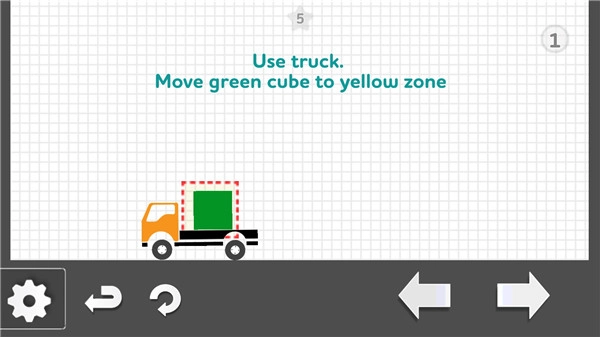 这一关中,玩家得先操控卡车向左移动,抵达方块的左侧位置,接着再让卡车向右移动,把绿色方块推到虚线框里,这样才能顺利过关。